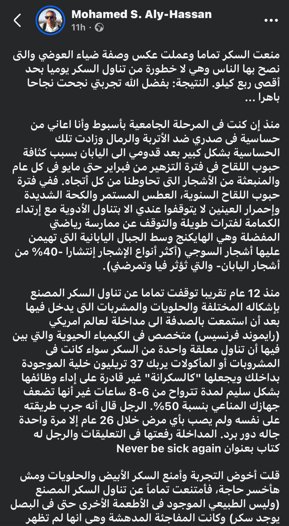 وأشار إلى أن قراره بالامتناع التام عن السكر جاء بعد اطلاعه على آراء علمية تتحدث عن تأثير السكر على الجسم والمناعة، مؤكدًا أنه بعد تطبيق ذلك، اختفت لديه أعراض الحساسية بشكل ملحوظ، ولم يعد بحاجة إلى الأدوية كما كان في السابق.