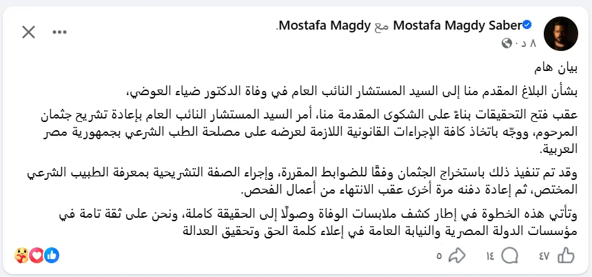 وأشار الدفاع إلى أن هذه الخطوة تأتي ضمن مسار قانوني يهدف للوصول إلى الحقيقة الكاملة بشأن ملابسات الوفاة، مؤكدًا ثقته في دور مؤسسات الدولة المصرية والنيابة العامة في تحقيق العدالة وإظهار الحقائق.