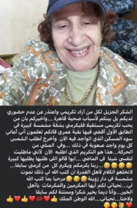 وكتبت عبر صفحتها على “فيسبوك” مؤكدة امتنانيها لكل المبادرات التي تحمل نية التكريم، إلا أنها لا تستطيع حضور الفعاليات بسبب وضعها الصحي.