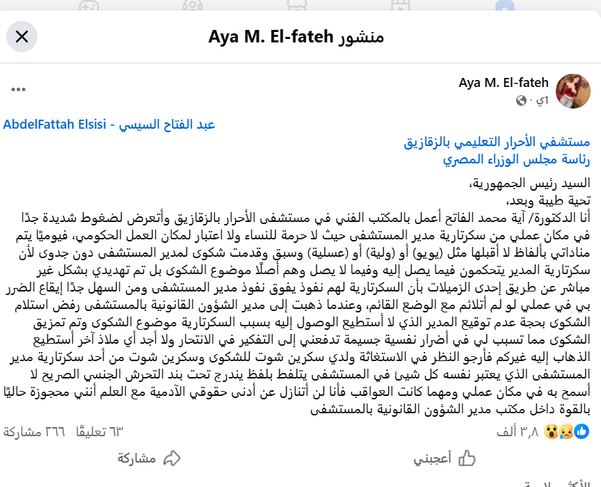 تختتم الطبيبة شهادتها بمطالبة الجهات المعنية بضرورة التدخل، وتوفير بيئة عمل آمنة تحترم الكوادر الطبية، وتضمن كرامتهم، مؤكدة أن الصمت عن مثل هذه الوقائع لا يؤدي إلا إلى تفاقم الأزمة، ويهدد استقرار المنظومة الصحية بأكملها.