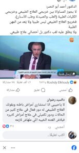 “لا ياحبيبي انا استشاري أمراض باطنه وبقولك العلاج الطبيعي له دور فعال في علاج كثير من الحالات ودور تكميلي في علاج أمراض كثيره فبلاش الفتنه الخيبه اللي ملهاش لازمه”.