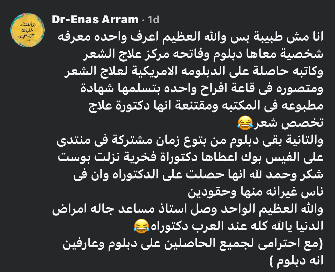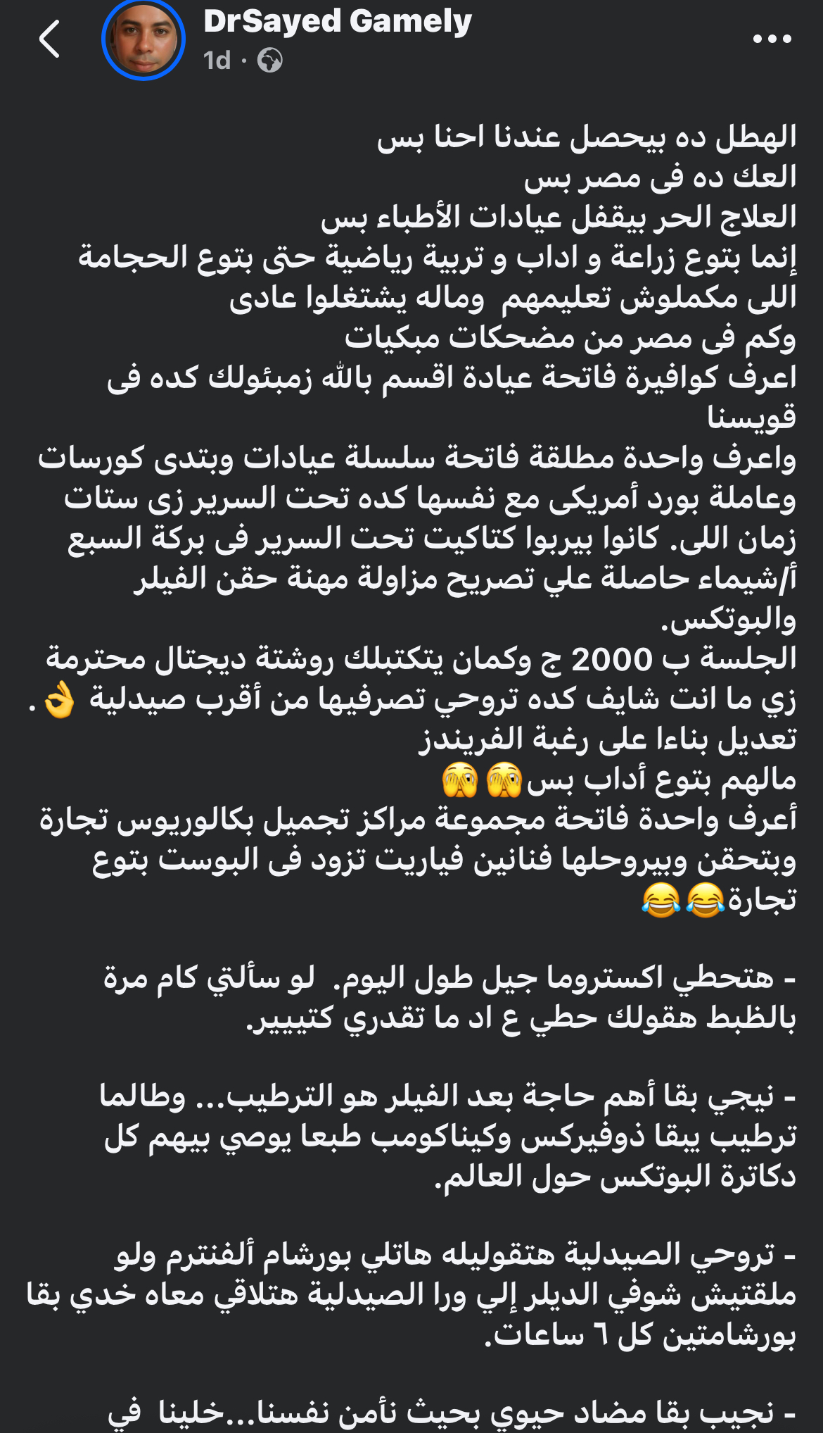 وقال معلقًا: “واعرف واحدة مطلقة فاتحة سلسلة عيادات وبتدى كورسات وعاملة بورد أمريكى مع نفسها كده تحت السرير زى ستات زمان اللى. كانوا بيربوا كتاكيت تحت السرير فى بركة السبع أ/شيماء حاصلة علي تصريح مزاولة مهنة حقن الفيلر والبوتكس”.
