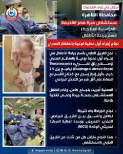 نجح الفريق الطبي بقسم جراحة الأطفال بمستشفى مبرة مصر القديمة (المؤسسة العلاجية) في إجراء أول عملية نوعية بالمنظار الصدري (Thoracoscopic) لعلاج رتق المريء (Esophageal Atresia Repair) لطفل رضيع يزن 2.5 كجم، في إنجاز يُسجل لأول مرة داخل القسم مع افتتاحه، وبأقل قدر ممكن من التدخل الجراحي.