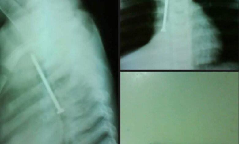مسمار طويل يمتد تقريبًا بطول القفص الصدري بالكامل داخل مجرى الهواء!