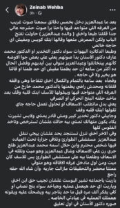 وتابعت أسرة الضحية في روايتها: «دخل عبدالعزيز غرفة الكشف ونام على الكرسي.. وبعد دقائق سمعنا صوت حشرجة عالية.. حاولت أفتح الباب الممرض منعني وقال مفيش حاجة. وبعد فترة خرج الدكتور وقال ابنك قلبه وقف بعد حقنة البنج».